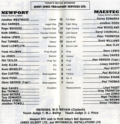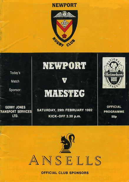"Maesteg, today's visitors, have pleasant memories of their trip to Rodney Parade last season, for they left for home with an 11 -3 victory under their belts. That success went a long way to ensuring that they would accompany Newport into the top division of the Heineken League this season, though they finally clinched promotion a fortnight later by trouncing Ebbw Vale 56-13 and scoring eleven tries."