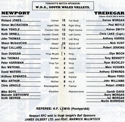 "Today Tredegar have other players who are serving them well, namely that stalwart inside half Martin Burridge, Ian Morgan, a quick-witted wing whose tries this season have reached double figures, Andrew Green, an astute outside half, Jason Powell, Darren Worgan, and David Moore, to mention just a handful."