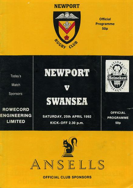 "This afternoon, the final curtain falls on Newport's 1991-2 home programme, and it is certainly ending with a flourish. Whatever the results of the league and cup clashes with Swansea's team of stars, Newport can look back on the season with a moderate amount of satisfaction. Besides their progress in the cup they justified their promotion to the top division of the Heineken League, though they faded away in disappointing fashion during the second half of the season."