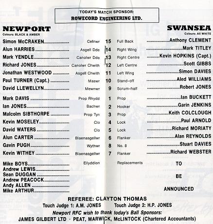 "The teams on that memorable occasion lined up as follows . . . NEWPORT: Chris Webber, Ken Davies, David Burcher (captain), Neil Brown, David Bale, Gareth Evans, Brynmor Williams, Colin Smart, Steve Jones, Rhys Morgan, Jeff Watkins, Tony Mogridge, Bryan Lease, Jeff Squire, Geoff Evans. SWANSEA: Roger Blyth, Huw Rees, Alan Meredith (captain), Gareth Jenkins, Alun Donovan, David Richards, Huw Davies, Hywel Hopkins, Jeff Herdman, Phil Llewellyn, Geoff Wheel, Barry Clegg, Trevor Evans, Richard Moriarty, Mark Keyworth. The referee was Clive Norling."