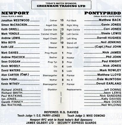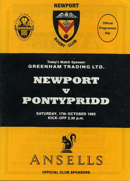 "Pontypridd, today's visitors to Rodney Parade, shared the honours with Newport in their Heineken League clashes last season. Newport, playing at home, defeated the Glamorgan men 13-6, but in the return game at Sardis Road Pontypridd pleased their supporters by running out 25-12 winners."
