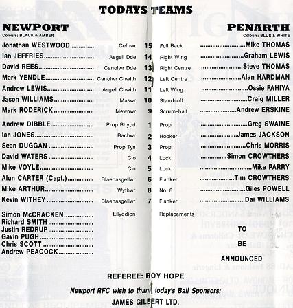 "Penarth, today's visitors to Rodney Parade, can claim the distinction of being among Newport's earliest opponents. Indeed, they first played Newport during the 1886-7 season, only ten years after Newport had moved their headquarters from Shaftesbury Park (then known as The Marches) to their present ground."