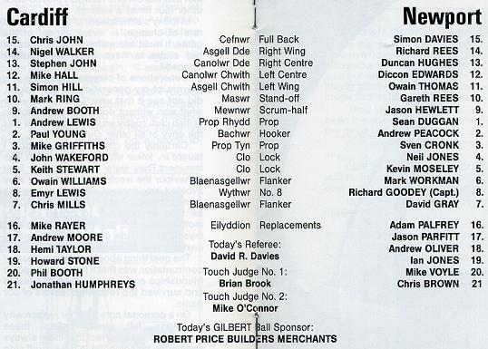 "Next Tuesday's European Cup match with Ulster is an exciting prospect indeed. Whilst suggesting earlier that Cardiff may have felt Tuesday's match could have been won, there is little doubt that by far the majority of the members and followers would, before kick-off, cheerfully have settled for the point. Now, it's all wide open and your support on Tuesday will be greatly appreciated. In the meantime, it's the warmest of Arms Park welcomes to our oldest and friendliest of rivals, Newport. We welcome their officials, players and followers, as we do everyone this afternoon. Our special thanks go to the match sponsors, Specsavers. We hope they have a memorable afternoon. D.G."
