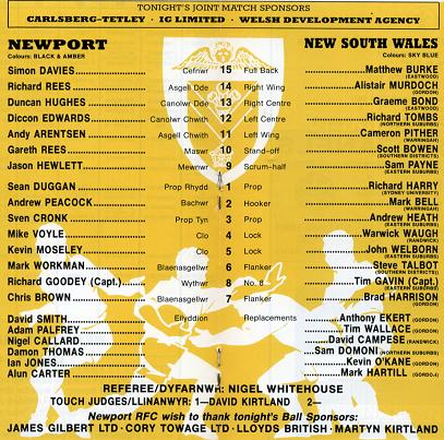 "Their first appearance, therefore, in Newport and Wales is, and has been, awaited with considerable enthusiasm. Tonight's team is sprinkled with some of the most successful players in Australia's history and none come with bigger reputations than David Campese, Tim Gavin, Willie Ofahengaue, Matthew Burke, to name but four, whose performances on the world stage are testament to that fact."