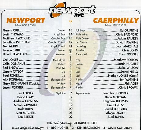 "Nathan Jones, the former Bridgend and Newport lock, has been appointed captain and included in his pack are two others with Newport connections in flankers Ben Watkins, son of former Newport favourite Jeff, and Chris Brown. Mike Wilson, formerly of Ebbw Vale, and Justin Hughes, last year's Aberavon captain, have brought solidity to the front row after the departures of Chris Ferris and Richard Jasper to Bridgend, with Danzi Niblo, the former Dunvant and Swansea lock, providing some fire in the lock position. Behind the scrum the Newport connection continues with former Cardiff, West Hartlepool and Neath player Chris John collecting the points at fly half and ex-Cambridge University and Neath centre Adam Palfrey providing some penetration. The powerful Sean Marshall, ex-Swansea and Cross Keys, has been in try scoring form this season, whilst on the other wing Chris Batsford has been signed from Bonymaen, where he scored a hatful of tries last season. David Hawkins, son of former Newport Youth captain and Newbridge full back Brian, has also joined from Bonymaen after a spell with Neath, and the much travelled Roddy Boobyer, brother of Ian and Neil, has been partnering him in the centre. In 6ft 6ins, 16st lOlbs full back Ed Griffiths, Caerphilly must lay claim to having the tallest full back in World Rugby, and at scrum half Chris Bridges, the former Welsh international, competes for the berth with Jonathan Hooper, a diminutive player recruited from Merthyr."