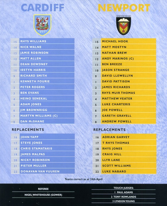 "But as always we will need to recover from a this setback and where better to start than here at the Arms Park against the Black and Ambers. Our recent league games against them have never been short of thrills and tries and hopefully there are more to come this evening. On New Year’s Day at Rodney Parade a very young Cardiff side showed what the future might hold as our development system reaped its rewards. All credit to Newport for winning that game by a record margin but we took solace in the displays of John Yapp, Dan McShane, Robin Sowden-Taylor and all the others on duty that evening."