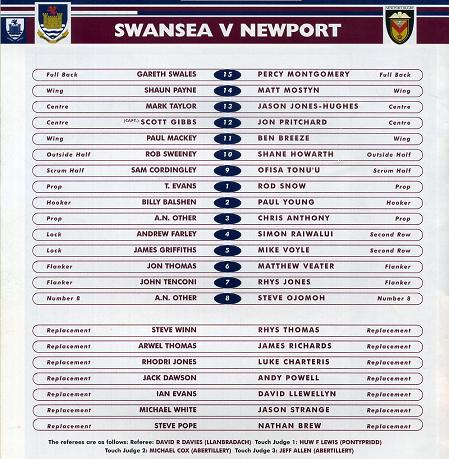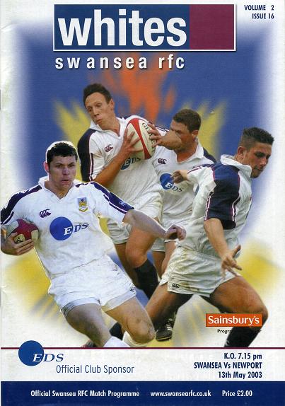 "Good evening everyone and welcome to St. Helens for this our last home game of the 2002/2003 Welsh League season against our visitors Newport, to whom we extend a warm welcome to their Board, Players, Coaches, Committee and Supporters and hope they have an enjoyable visit to St.Helens. It would be an understatement to say that writing this "Welcome" was not easy having just played Caerphilly and just before we play Llanelli, with the knowledge that many of the players would have possibly played their last game for Swansea not just as a professional team but Swansea Rugby Club. Equally so those of us who have supported the Club for over many years to come to terms with the change and look forward to the future to whatever it might hold, and hope that we will be able to continue to support the "WHITES" as we have done in the past."