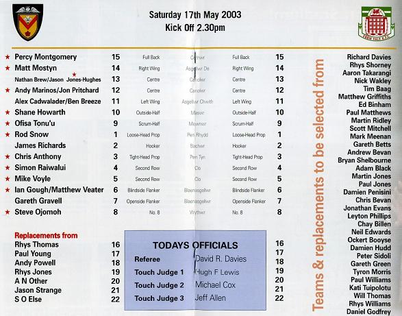 "Dennis Perrott, Haydn Mainwaring, Des Greenslade, Neville Johnson, Barry Edwards, Geoff Whitson, Neil McPherson, Richard Barrell, Mapson Williams, Paul Young, Jeff Squire, James Richards, Percy Jones, Keith James, Chris Webber, Reg Plummer, Gordon Ross, Norman Morgan, David Cornwall, Len Martin, Lynn Jones, Stanley Williams, Gary Sutton, Matt Mostyn, Albert Fear, Andrew Wagstaff, Robert Ackerman, Del Haines, Ivor Taylor, Bryn Williams, Gareth Gravell, Phil Ward, John Evans, Andy Allen, Vincent Griffiths, Harry Gould, Reg Edwards, John Ryan, Bob Phillips, John Herrera, Nigel Callard, Tom Sterry, Ernie Hammett, Alf Panting, Jerry Shea, Alun Carter, Brian Mills, Gareth Rees, Robert Dibble, Gareth Taylor, Phil Waller, Justin Thomas, Simon Raiwalui, Richard Rees, Willie Llewellyn, Alan Billinghurst, Roger Francis, Shane Howarth, Keiron Gregory, Sean Duggan, Percy Montgomery, George Andrews, Onllwyn Brace, Simon Enoch, Richard Goodey, Roger Bidgood, David Ford, Luke Nabaro, John Jeffrey, David Gray, W H "Duff" Lewis, Andy Marines, MarkYendle, Leighton Davies, Matthew Veater, Wallace Watts, Tom Pearson, Jason Jones-Hughes, Andrew Evans, Steve Ojomoh, Peter Williams, Jack Hancock, Robin Williams, Gary Hicks, Richard Smith, Joe Powell, Bill Morris, MikeVoyle, Richie Wills, Peter Rose, Jon Pritchard, Rob Guilfoyle, Dr. W J Roche, Rhys Jones, Kevin Withey, Alan "Algy" Thomas, David Jones, David Pattison, Geoff Evans, Norman Edwards, Stuart Kimpton, James Hannan, Tom Clapp, Martyn Llewellyn, Phil Waters, Frank Hillman, Andrew Powell, Ricky Stewart, Chris Manley, Paul Rees, Lawrence Gray, Eric Phillips, Haldane Luscombe, Tony Hurford, Chris Wyatt, Richard Stride, Richard Parks, Jason Strange, Brian Cresswell, Keith Poole, Jack Wetter, Rod Snow, W."Bunner" Travers, Raymond Ralph, Martin Webber, Jason Forster, David Rogers, Peter Buxton, Ofisa Tonu'u, Darren Edwards, Emyr Lewis, Peter Rees, Steve Geary, Clive Boulter, Gerry Fuller, Ian Hall, Garfield Owen, Harold Davies, Stuart Barnes, Colin Smart, Bill Everson, Roy Burnett, "Ike" Williams, John Churchill, Steve Lewis, Keri Williams, Peter Bolland, Nigel Wilkes, Keith Rowlands, Danny Wilson, Steve Willis, Adam Palfrey, James Alvis, Gareth Cull, Chris Scott, Alun Harries, Rhys Morgan, J.E.C. "Bird" Partridge, Stuart Watkins, Gwyn Nicholls, Ken Plummer, Lee Fortey, Lloyd Davies, Dennis Hughes, David Burcher, Glyn Davidge, Gus Gould, Jason Hewlett, Sven Cronk, David Smith, Louis Phillips, Will Dowell, Jonathan Westwood, Neil Brown, Bryn Meredith, Arthur Gould, David Waters, Del Haines, Simon McCracken, Adrian Garvey, Andrew Lewis, Matthew J. Watkins, Robbie Kempson, Andrew Peacock, Ceri Jones, Andrew Dibble, Tommy Vile, David Watkins, Ken Jones, Colin Smart, Peter Williams, Byron Hayward, Ben Atkins, Shaun Connor, Keith Lee, Ian Jeffreys, Nicky Lloyd, John Colderley, Jan Machacek, Vince Davies, Walter Martin, Ian Gough, Ben Watkins, Matthew Robinson, Billy Watkins, Jeff Palmer, Gary Abraham, Andy Pocock, Teddy Morgan, Gareth Evans, Laurie Daniels, Martin Parry, William Phillips, Harry Packer, George Boots, George "Twyber" Travers, Dr. C.A. Anderson, Andrew Perry, Adrian Parry, Matt Pini, Percy Jones, Chris John, Eddie Mogford, Richard Taylor, Harry Day, Trevor Brewer, Ben Breeze, Reg Skrimshire, Damien Cummins, Mark Davis, Chris Scott, Bobby Owen, Jack Morley, Ken Richards, Neil Jones, Doug Ackerman, Brian Perrins, Graham Bevan, Ron Herrera, Keith Orrell, Colin Prescott, Bob Prosser, W Clifford Phillips, Tom Graham, Tom Baker Jones, Alix Popham, Ben Edwards, Gary Abraham, Jeff Hazzard, David Barry, Brian Scrivens, Fred Sagoe, Hassan Ali, Keith Jarrett, Chris Anthony, Llyr Lane, Brian Price, Gary Teichmann, Jim McCreedy, Nigel Wilks, Chris Scott, Franco Smith, Ian Ford, Gordon Britton, Theo Harding, Nathan Brew, Vivian Law, Ian McJennett, Richie Collins, Jim Dale, John Widdicombe, Peter Rogers, Roger Powell, Mark Workman, John Mantle, Mike" Watkins, Matt Cardey, John Gwilliam, David Bale, Alan Skirving, Phil Steele, Roy Duggan, Frank Trott, Peter Davies, Brian Jones, Kevin Moseley, Steve Jones, Barry Llewellyn, Billy Raybould, Scott Mitchell, Dale Burn, Paul Cooke, Brynmor Williams, Walter Legge, Beddoe Thomas, Jeff Watkins, Peter Rees, R.T "Bob" Evans, Charlie Newman, Tony Mogridge, Paul Turner, Wyatt Gould, Gordon Pritchard, Ian Barnard, Brian Lease, Hedley Rowland, Mike Lewis, Gwilym Treharne, David Rees, Byron Thomas, Peter Smith, L.E.T Jones, Alex Cadwallader, John Rogers, Paul Evans, Adrian Hearn, Clive Jenkins, Arthur Boucher, Alan "Archie" Evans, Paul Watts, Vic Perrins, Malcolm Thomas, Jonathan Callard, Jehoida Hodges, Dr.Tom Smyth, Will Geen, Ian Jones, Duncan Hughes, Ben Atkins, Gwili Jenkins, Ken Spray, John Anderson, JacK Hurrell... and many, many more."