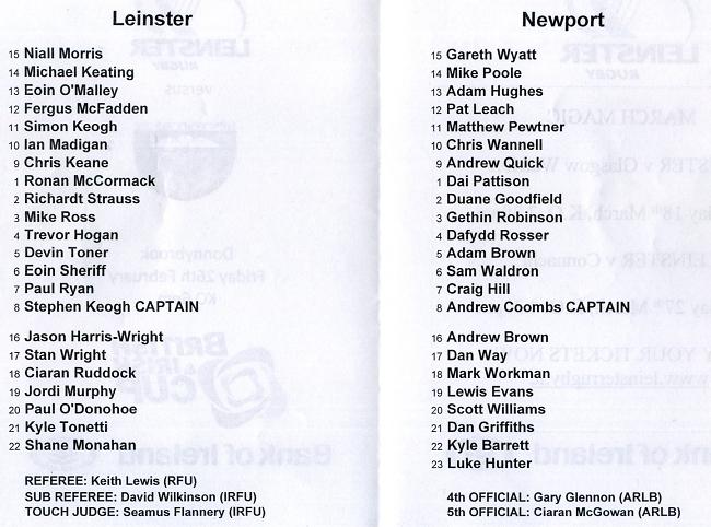 "LEINSTER: N Morris; M Keating, E O'Malley, F McFadden, Simon Keogh; I Madigan, C Keane; R McCormack , R Strauss, M Ross, T Hogan, D Toner, E Sheriff, P Ryan. Stephen Keogh (capt). Replacements: J Murphy for Keogh (17), P O'Donohoe for Keane (h-t), S Wright for R McCormack (51), S Monahan for Morris (68), J Harris-Wright for Strauss (70), K Tonetti for Keating (78) mins)"