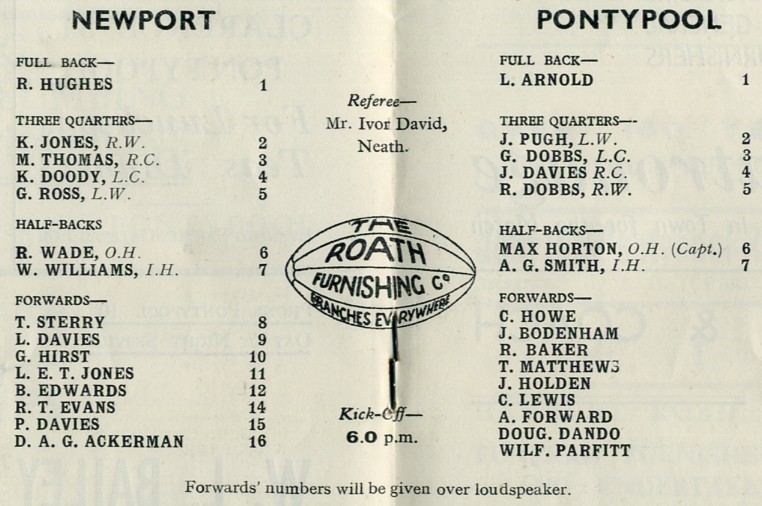 "To-day Pontypool celebrate their golden jubilee and pay tribute to the legions who have laboured since fifty years ago to raise them out of nothing to their present place among the leading clubs in the country. This match is the climax of a glorious half-century and we look forward confidently to a great feast of all that is best in the handling game, provided and enjoyed in the highest spirit of sportsmanship, so that it will be worthy of the occasion and long to be remembered."