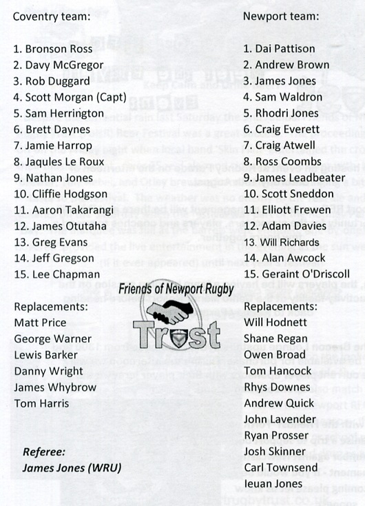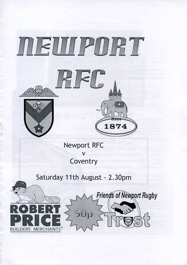 "Today we welcome Coventry to Rodney Parade for a preseason friendly fixture. Coventry were founded in 1874, as were Newport, and have a proud and illustrious history. Among the famous players to have played for Coventry are David Duckham, Dusty Hare, Peter Jackson, Fran Cotton and Barrie Corliss, all English internationals. Ron Jones who represented Wales in the back-row also played for Coventry and was in the team that beat England 34-21 in 1967 which saw the incredible debut by Newport's Keith Jarrett. Playing at full-back he scored 19 points (21 by today's scoring) with 1 try, 2 penalties and 5 conversions. Also in the team that day were Newport's David Watkins, Stuart Watkins and Brian Price."