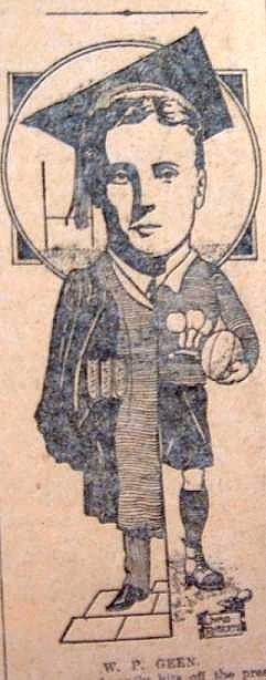 "Willie Geen, a pretty, fair-haired lad, ran in boys' races at Newport from a very early age; and as he grew up developed speed and exceptional dodging power on the football field. He played for Oxford University in 1910-11-12, with Poulton-Palmer as his centre in the two former seasons, and was on the winning side on each occasion. He played for Newport in the vacations (against them for the University), and provided dazzling entertainment, for his runs reminded the older generation of Arthur Gould's mastery. He was selected as a centre for Wales in 1913; played against South Africa and England, and in the game with Ireland showed brilliance and judgment which led to two tries in a game Wales won by sixteen points to thirteen. He played only these three games - what happened to him in 1914 I cannot recall; but War came, and he was one of those who had no grave, for he was in the path of a high explosive shell, and the place thereof knew him no more."
