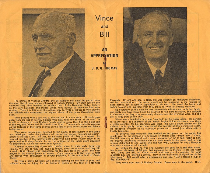 "In the ninety odd years of its history, the club has been extremely fortunate in the large number of its members who have given voluntary service in many directions. Only those who are involved in the inner workings of the club which covers so many playing activities and a large social centre, can appreciate how much it depends on the loyalty and sacrifice of such members. Vince Griffiths was a wonderful example of a man who felt all this was worthwhile to a club which he said on many occasions had done so much for him."