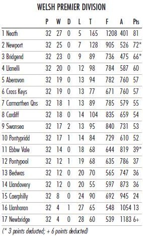 The pack was again outstanding with Matt Veater, Sam Waldron, Nick Kelly, Neil Edwards and Rhys Jones to the fore but a lack of cutting edge behind at times proved to be costly although Gareth Chapman always looked dangerous. Young lock Ben Thomson proved to a real find and played for Wales U21 while Dan Griffiths also started to show well after an indifferent start to the season while scrum-half James Ireland, although at times erratic, showed some real qualities. Wales U21 fullback Ricky Williams also looked a star in the making.