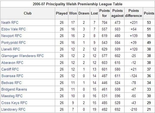 | 1 | Newport | 18 | - | 0 | Cinderford | 16 Aug | | | | | 2 | Cinderford | 13 | - | 24 | Newport | 23 Aug | | | | | 3 | Newport | 12 | - | 56 | Bristol Rugby | 30 Aug | | | | | 4 | Newport | 30 | - | 3 | Cardiff | 13 Sep |  | | | | 5 | Newport | 67 | - | 5 | Llandovery | 20 Sep |  | | | | 6 | Bridgend | 17 | - | 18 | Newport | 27 Sep | | | | | 7 | Ebbw Vale | 3 | - | 9 | Newport | 04 Oct | | | | | 8 | Neath | 29 | - | 19 | Newport | 11 Oct | | | | | 9 | Newport | 65 | - | 21 | Swansea | 18 Oct |  | | | | 10 | Glamorgan Wanderers | 16 | - | 28 | Newport | 25 Oct | | | | | 11 | Newport | 13 | - | 17 | Llanelli | 01 Nov |  | | | | 12 | Newport | 35 | - | 0 | Pontypridd | 07 Nov |  | | | | 13 | Newport | 12 | - | 17 | Aberavon | 15 Nov |  | | | | 14 | Blackheath | 26 | - | 14 | Newport | 22 Nov |  | | | | 15 | Newport | 19 | - | 3 | Pontypool | 28 Nov |  |  | | | 16 | Newport | 31 | - | 20 | Bedwas | 06 Dec |  |  | | | 17 | Newport | 40 | - | 21 | Blackwood | 20 Dec |  | | | | 18 | Cross Keys | 13 | - | 9 | Newport | 27 Dec | | | | | 19 | Cardiff | 36 | - | 26 | Newport | 17 Jan | | | | | 20 | Newport | 44 | - | 7 | Bridgend | 24 Jan |  | | | | 21 | Newport | 37 | - | 7 | Ebbw Vale | 31 Jan |  | | | | 22 | Newport | 38 | - | 18 | Llandovery | 21 Feb |  | | | | 23 | Newport | 34 | - | 32 | Neath | 28 Feb |  | | | | 24 | Swansea | 18 | - | 29 | Newport | 07 Mar | | | | | 25 | Newport | 39 | - | 15 | Bridgend | 20 Mar |  | | | | 26 | Aberavon | 20 | - | 10 | Newport | 27 Mar | | | | | 27 | Pontypool | 12 | - | 9 | Newport | 31 Mar | | | | | 28 | Newport | 39 | - | 6 | Glamorgan Wanderers | 04 Apr |  | | | | 29 | Pontypridd | 28 | - | 26 | Newport | 07 Apr | | | | | 30 | Newport | 17 | - | 32 | Cross Keys | 11 Apr |  | | | | 31 | Llandovery | 16 | - | 32 | Newport | 18 Apr | | | | | 32 | Llanelli | 10 | - | 36 | Newport | 22 Apr | | | | | 33 | Aberavon | 20 | - | 34 | Newport | 25 Apr | | | | | 34 | Bedwas | 22 | - | 33 | Newport | 02 May | | | |