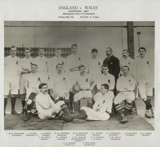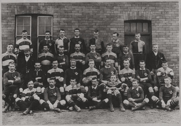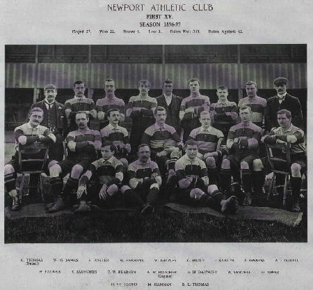Arthur Boucher was again captain in 1896-97 which was a good season with only 4 matches lost. The retirement of Harry Packer and Wallace Watts weakened the side and Arthur Gould only played 13 games (scoring 7t and 9dg) but captained Wales to victory over England in his 27th match for Wales. This game was played at Rodney Parade on 9th January 1897, Wales 11pts England Nil. W. Groves retired before the end of the season. Wallace Watts was the outstanding forward and Arthur Gould led the scoring with Bert Dauncey scoring 13t and Tom Pearson 11t. T. Saunders (27) and G. Ll. Lloyd (26), J. Jenkins (26), and A. Sawtell (26) led the appearances.