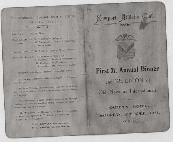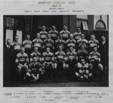 On 30th April 1921 Newport fielded a team of 15 internationals against Bristol (Won 17 v 0): 10 Welsh, 3 English, 1 Scottish and 1 Irish and still had 3 ex-Welsh internationals in reserve! Of the 15, four were international captains and four were Newport captains and 2 of the 3 reserves were ex-Newport captains also. Never in history had any club been able to field such a team. Click for Match Information and photos.