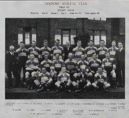 1923-24 under captain E. Reg Edwards saw Oxford University, Pill Harriers and Northampton beat Newport for the first time. During the season 36 players were called on as Newport continued to play attacking rugby. They had excellent forwards in McPherson, Whitfield, Roberts, Edwards, Tom Jones, Roche, M. Williams, Hathway, Waite, Bown, H. Phillips and O'Leary. Fine play by outside half Vince Griffiths was rewarded with Welsh and British Lions selection.