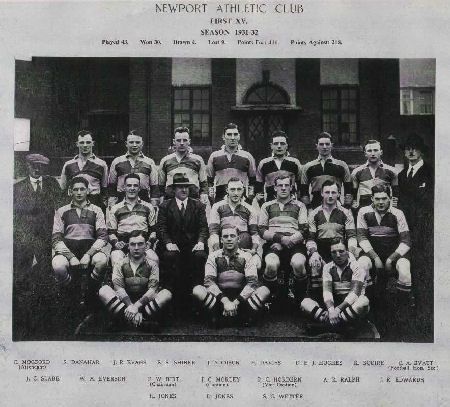 Jack Morley became Newport's youngest ever captain at the age of 22yrs in 1931-32 and led a Newport side who contained many young and inexperienced players to a successful season. Ralph and Morley concentrated on attack and the team produced some very attractive rugby. It resulted in Dickie Ralph having his best season for Newport. His individual brilliance won many games. Sid Wetter, nephew of Jack, made a great debut at inside half while Morley was top scorer with 20 tries and 4 dropped goals, playing several games at centre. Vice captain and former England international Peter Hordern missed many matches through injury and for once no Newport player played in any internationals. J. R. (John) Evans, who made his debut straight from Newport High School at the end of the previous season started to show great promise. Bill Everson, J. A. Addison, Sam Danahar and Dai Jones all led the appearances with 35.