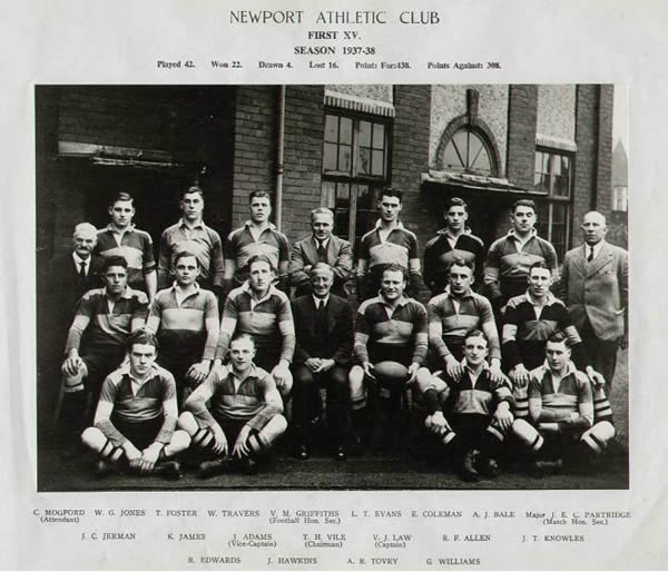 Ex-Pill Harriers forward Trevor Foster playing his only full season for Newport at blindside was top try scorer with 12 but went North to Bradford Northern for a wonderful career as player, coach and legislator. Leslie Evans had another good season as did W. G. (Bill) Jones, Alf Bale, Jack Jerman and Ernie Coleman. Roger Wade was studying at St Mary's Hospital and a satisfactory partner was never found for Jim Hawkins.