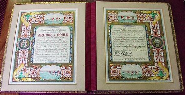 "The testimonial to Arthur Gould, the renowned Welsh footballer, which took the form of the title-deeds of the house, Thornbury, Clytha-park, Newport, together with an illuminated address, was presented to him on Easter Monday evening at the Drill-Hall, Stow-hill, Newport. The actual presentation was preceded by a complimentary banquet, at which Sir John Llewellyn, Bart., M.P., president of the Welsh Rugby Football Union, took the chair. Sir John was supported on his immediate right by the guest of the evening (Arthur Gould), and the other supporters were the mayor of Newport (Councillor T. Goldsworthy), wearing his chain of office; the Rev. T. L. Lister, vicar of St. Mark's; Mr. D. A. Thomas, M.P., Colonel Wallis, J.P., Mr Clifford Cory, J.P., Dr. Marsh, Mr. T. E. Watson, J.P., Mr. W. Lyndon Moore, Mr. T. J. Beynon, J.P., Mr. E. Bellerby, Mr. W. D. Phillips (Cardiff), Mr. J. Livingstone (Swansea), Alderman H. P. Charles (Neath), Mr. J. Routledge (Rockcliff), Mr. A. Henshaw, Mr. T. Parry, J.P., Mr. R. Stratton, Mr. W. E. Heard, J.P., Mr. H. D. Yorath, Councillor G. H. Llewellyn, Mr. Checci (Argentine Consul), Mr. T. Williams (Llwynypia),Mr. H. P. Jenkins, Colonel Mansel, Mr. L. H. Hornby, Mr. T. H. Mordey, Councillor F. Phillips, Mr. Edward Phillips, and others. The company which numbered over 250, comprised members of the Newport Athletic Club, the Rockcliff football team, which had played Newport during the day, and a large number of well-known townsmen of Newport. Mr. S. D. Dean was the caterer. The balconies were occupied by ladies. On the orchestra Mr. I. Jacobs string band played a selection of music, and, in front of the balcony rail, were Rugby footballs, Indian clubs &c., together with a portrait of Arthur Gould and a photograph of Thornbury, the house which formed the testimonial. The arrangements, admirably carried out, involved an enormous amount of work upon the senior hon. Secretary and promoter of the fund, Mr. W. J. Orders."