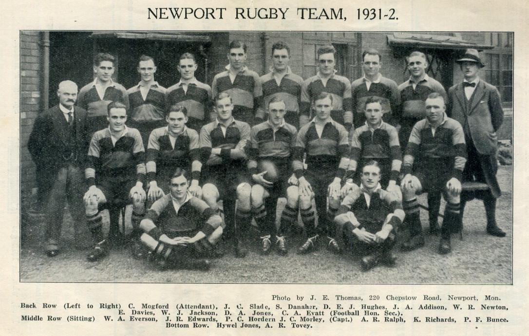 "NEWPORT.- W. A. Everson, back; J. C. Morley (captain), K. Richards, J. R. Edwards, and K. Watkins, three-quarter backs; A. R. Ralph and R. Tovey, half-backs; P. C. Horden, D. A. Jones, J. A. Addison, D. E. J. Hughes, H. C. Peacock, W. R. Newton, J. C. Slade, and S. Danaher, forwards."