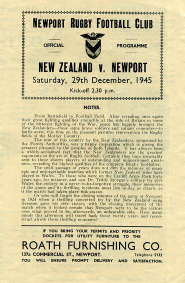 What better way to celebrate the first Christmas after the end of the Second World War than a fixture against the touring Kiwis. Later to be dubbed by John Billot in his book 'All Blacks in Wales' as "the team with instant appeal". A newly developing Newport side was pitched against a similarly unfamiliar Kiwi team made up of touring New Zealand servicemen under the banner New Zealand Army.