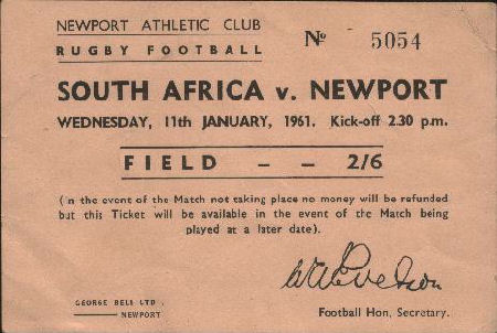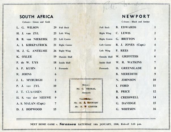 This was the closest that any club team came to beating this particular South African touring party and eventually they would lose only one match during the whole tour. That was against the Barbarians in Cardiff when the Baba's team contained three Newport players - Brian Jones, Brian Price and Billy Watkins.