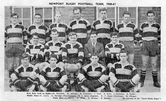 "NEWPORT.- B. Edwards; C. Lewis, G. Britton, B. J. Jones, P. Rees; W. Griffiths, W. R. Watkins; D. Greenslade, B. Meredith, N. Johnson, I. Ford, B. Price, B. Cresswell, G. Davidge, G. Whitson."