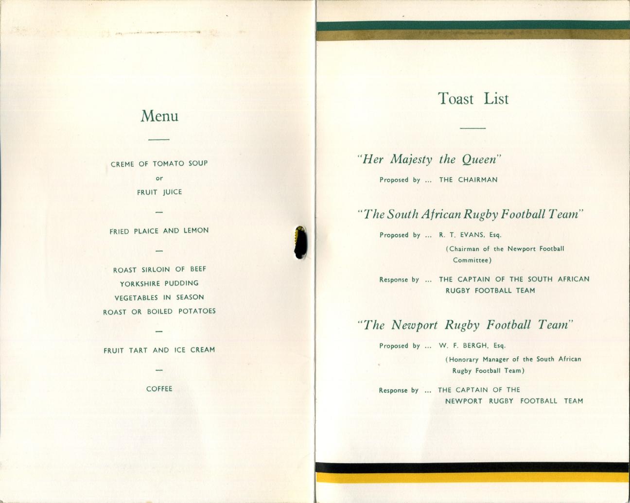 "The Fifth Springboks come to us this afternoon with an invincible record and fresh from their triumph over England at Twickenham last Saturday. Undoubtedly they have followed our fortunes through the season so far, and are aware of our lack of lustre during the last few months. I am sure that they sympathise with us, particularly in the loss of Norman Morgan. Brian Jones has under his command a good blend of youth and experience and he will be keen to add another "Springbok Head" to partner the one adorning our tea-room which was won so gloriously from W. A. Millar's Second Springboks in 1912. To all the South African party I offer a hearty welcome, and I trust that the game today will be accorded a high rating in their list of pleasant memories after they return to their homeland."