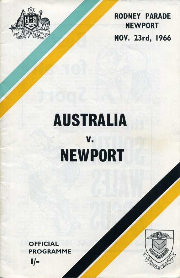 "It gives me the greatest pleasure on the occasion of the Newport fixture against the touring Australian side to renew acquaintances, if only by way of this programme, with our thousands of Welsh friends who did much for making our 1963/4 tour the pleasant memory it will always remain. I have spoken many times to Frank Kilby, Neal McPhail and the other members of our Touring party who without exception regard the four months we spent in the U.K. as the greatest days in our rugby lives and very prominent in our thoughts are our memories of Wales."