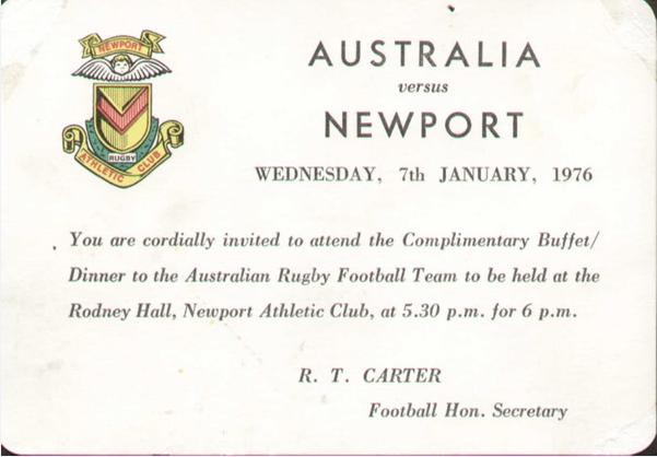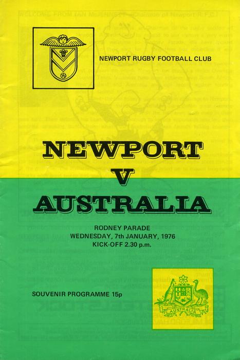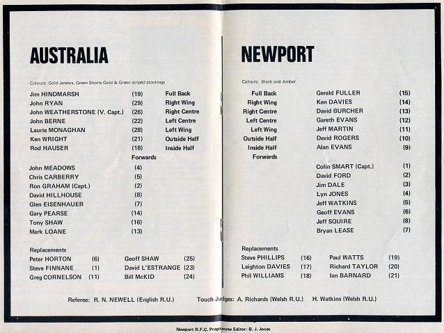 "Skipper John Hipwell who played here at Rodney Parade in partnership with Phil Hawthorn in 1966, and Geoff Richardson in 1973, will have pointed out to the touring party that no Australian side has won on this ground since 1947. Bob Davidson's team in 1957 were defeated by 11 pts. to Nil, John Thornetts' 1966 team drew 3 pts. each, while Peter Sullivans 1973 team were defeated 19 pts. to 11 pts., by East Wales. In order to overcome this 'hoodoo', it has been rumoured that Geoff Shaw, Mark Loane, and Mike Fitzgerald who trained here a few weeks ago while receiving treatment at the 'White House' from Gerry Lewis, were really spies for Ross Turnbull and Dave Brockhoff."