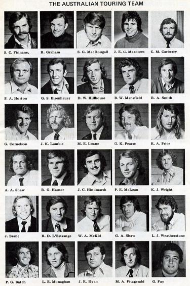"AUSTRALIANS: J. C. Hindmarsh: L. F. Monaghan, L. J. Weatherstone, J. Berne, J. R. Ryan, K. J. Wright, R. G. Hauser: J. E. C. Meadows, C. M. Carberry, R. Graham (captain), G. S. Eisenhauer, D. W. Hillhouse, G. K. Pearse, M. Loane, A. A. Shaw."