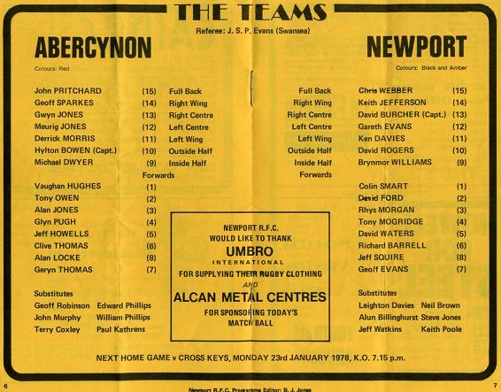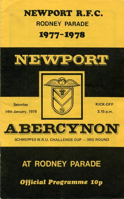 "This afternoon we are delighted to welcome Abercynon to Rodney Parade, in the 3rd round of the Schweppes W.R.U. Challenge Cup. Their success in reaching this stage of the competition has created a great deal of interest, and they are certain of at least a thousand voices to urge them on this afternoon. The 'Special Train' carrying 750 supporters, is due to arrive at Newport Station at 1.40 p.m., so if Red & Black has engulfed you on the way to the ground, you know where they came from. Such is the interest generated in Abercynon, the local Welsh League Football Club have postponed their fixture for today to enable them to be present at 'the Parade' to lend vocal support. While the Abercynon Male Voice Choir will also be present in full to sing 'Songs of Praise' to their heroes. Cup fever has certainly hit unfashionable clubs during the last few seasons (Newport have every reason to remember Tumble) but none more so than Abercynon, and they are confident of creating a sensation this afternoon."