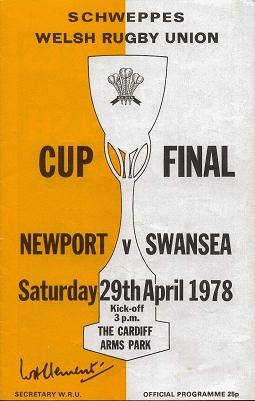 After narrow wins against Pontypridd and Aberavon few gave Newport much chance to win the final and so it was to be when Newport could win little possession in the final against a strong Swansea side. However, full credit to Newport who absorbed tremendous presssure and kept the score very respectable. Newport only conceded 3 tries in their 6 Cup games and the only try of the final came as a result of Swansea prop Phil Llewellyn deflecting a throw-in to hooker Jeff Herdman who dashed over from 10yds. David Richards dropped a goal from a pass that bounced twice and Gareth Jenkins dropped a goal from an indirect penalty tap. Roger Blythe put over Swansea?s other points with a penalty and Chris Webber scored all of Newport?s points with 3 penalties.