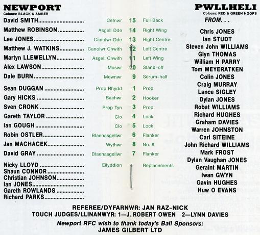 Pwllhelli, who started this tie with four of their five New Zealanders and used the other as a 70th minute replacement, were gallant losers. Twice in the opening quarter the visitors held the lead through Kiwis full-back Mark Frost's 1st minute penalty and a splendid try 11 minutes later from centre Karl Siteine who was a hugely impressive figure throughout. The lead lasted until the 21st minute when Newport's scrummaging power led to the first of Jan Machacek's two pushover tries. Wingers Matthew Robinson and Martyn Llewellyn ran in corner tries and Alex Lawson landed two penalty goals and five conversions, one for a 29th minute penalty try. A back-peddling Pwllheli scrum was saved another conceded push-over when scrum half Graham Davies kicked the ball out of the Newport scrum.