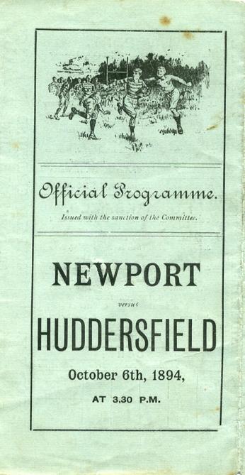 "The game was ten minutes late in starting, when the visitors kicked off, and with a strong forward rush at once into the home territory. A very sharp punt by Ll. Thomas, and another by Arthur Gould, altered the position to the Huddersfield 25, but it was apparent from the start that the game was to be fought out amongst the forwards. The visitors were very sharp at the line out and in the loose, and the tackling was keen and swift, Charlie Thomas, in his position at half, once or twice in the opening bouts played too much for his own hand, rather than passing out. First blood fell to Newport. From a strong dribble by Mat Hannan, Packer rushed up and kicked over the line, the leather afterwards being kicked dead. Huddersfield, soon after the drop-out, were penalised for illegally putting the ball in the scrum, and from a good drop by Ll. Thomas, the visitors' 25 was reached. By fast open work amongst the forwards the Tykes got out to mid-field. After a nice burst by Mitchell the ball went back to Gould, who planted in touch beyond the visitors' 25 flag, and Graham and Watts took it from the line out to within a few yards of the Yorkshire position. Here Mat Hannan got round the scrum cleverly, but in throwing to W. Ll. Thomas he threw forward, and a good chance was lost. Fast forward play was still kept up in the Huddersfield 25. Mat Hannan got hold again, and shot out to Gould, who got within a few yards of the line and then passed to Thomas, who failed to take, but nailed the man who rushed up for the pass. It really looked as if Gould himself could have got in with a struggle. The Huddersfield forwards rushed to mid-field. Here T. Dickenson, one of the visiting forwards, was hurt in a hot scrum, and went off apparently with an injury to his ribs. Long kicking on both sides left matters in the Tyke's half. Thomas and Gould between them struggled to within a few yards of the line, but the final pass, intended for Graham, went astray. Still the game was all against the visitors, although their defence was brilliant. Gould took his passes and got in both sprints and kicks, with pure precision. Dickenson resumed play after ten minutes' respite. Following this was a bit of mulling between James and Dauncey, and Huddersfield had a good opening for running out. One of the players made his mark at the home 25, but Gould fielded well, and in reply found touch at mid-field. Centre play ruled for a time, until, from a long kick by the Huddersfield custodian, which England failed to hold, the home 25 became the venue, and here the forwards went at it hot and strong again. Mitchell, who had gone full back instead of Alland, for the Yorkshire men, took a shot at goal, and the long drop was dangerously nearly successful. From the visitors' 25 Groves got away with a strong rush from the scrum, and the ball being picked up by Charlie Thomas, he and Mat Hannan between them got right up to the visitors' line by means of inter-passing, but the ball rolled over, and only a minor ensued. Newport now got fairly into their stride, the forwards making great pressure. Jim Hannan got possession from a scrum, and passed out to Groves, who raced over with a try, but failed to negotiate the place-kick. Centre play ensued after the drop out, Huddersfield playing a very keen forward game, with little or no combination behind. Half time was then called, with the score standing:-"