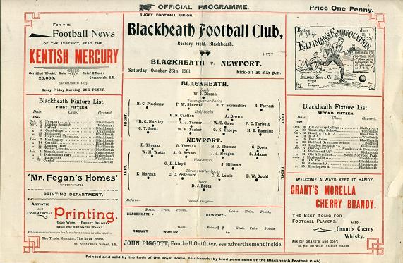 "The annual visit of the Newport fifteen to the Rectory Field, Blackheath, proved, as usual, a decided attraction, probably close on 10,000 spectators being present. As could only be expected on the season's form, the Newport men had no great difficulty in winning by a handsome margin. As a matter of fact they won by four goals (one dropped) and a try to a dropped goal. It was a curious match. Quite early Blackheath lost Tarbutt, one of their forwards, but that incident had little influence on the game. Blackheath always held their own forward, and their backs tackled admirably. In defence Blackheath were excellent, but they did not display any ability as an attacking force. Their halves were painfully weak, and as a consequence a very fair three-quarter line had no chance. On the other hand, the Newport backs showed great resource and combination. Llewellyn Lloyd, the international, was in great form at half-back, and he not only had a hand in every try, but dropped a neat goal. Time after time he opened the game for his three-quarters, and though some of the Newport passing was wild, much was excellent. The game generally went in the direction of the right wing, and E. Morgan, well looked after by his centre, C. E. Lewis, had no difficulty in scoring three tries. G. C. Pritchard, the left centre, gained the other try, so that all the scoring for Newport was accomplished by the back division. To the captain, R. T. Skrimshire, fell the distinction of dropping the goal for Blackheath, and a beautiful effort it was."