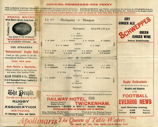 "It was a very keen game with little to choose between the two sides. If anything the Harlequins had the better of the attacking movements, although their opportunities were rather fewer than those offered by the Newport forwards to their back division."