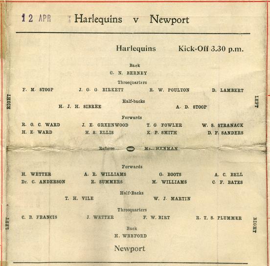 "HARLEQUINS. - G. N. Berney, back; D. Lambert, R. W. Poulto, J. G. Birkett, and F. M. Stoop, three-quarter backs; H. J. Sibree and A. D. Stoop, half-backs; R. O. C. Ward, J. E. Greenwood, T. G. Fowler, H. E. Ward, W. S. Stranach, H. S. Ellis, K. P. Smith, and D. F. Sanders, forwards."