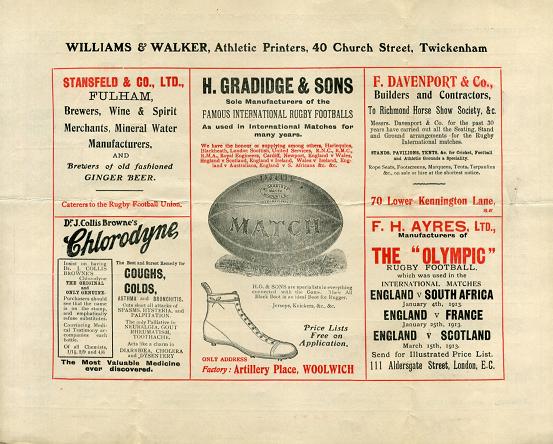 "Both sides played up to their form forward and it was a very hard struggle as to which team got the better of it. Certainly the Harlequins forwards did more work in the scrummage than is their usual custom, and there was no winger nor a suspicion of one. The tackling was quite the feature of what in the end proved to be a distinctly disappointing game. There were too many free kicks, some of them the result of foul play, and several of the players seemed bent on spoiling their opponents' play rather than carrying out their own attacking movements."