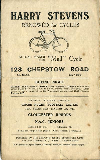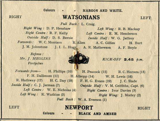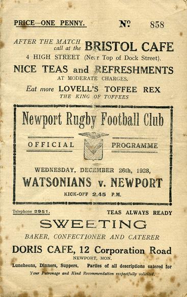 "Ever since the Watsonians first visited Newport on January 1st, 1894, they have constituted the chief attraction of Newport's Christmas programme of matches. They are the only Scottish Club side we in Wales are privileged to see, and there is no denying that they have worthily upheld the tradition of Scottish Rugby on their annual visits here. We offer them once more the heartiest of welcomes."