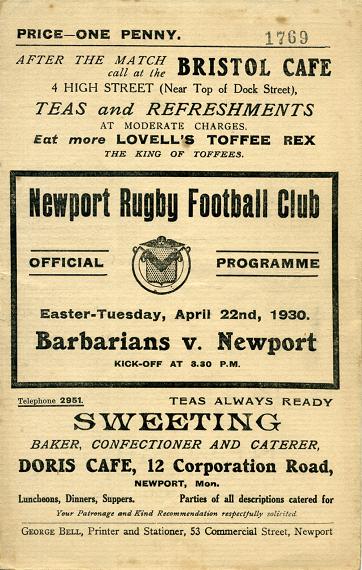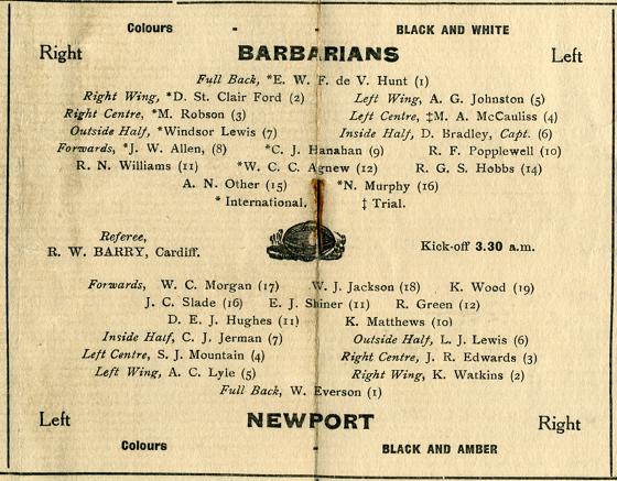 "There have been periods when Newport have been able to take the field against the Barbarbians confident of a fairly easy victory - from 1905 till 1925, Newport never once failed to run into double figures - but that feeling is certainly not present now. Twice in the last four years have the Barbarians won here - in 1926 by 1 p.g., 1 try, 6 pts. to 1 goal, 5 pts., and last April by 1 d.g., 4 pts. to 1 p.g., 3 pts."