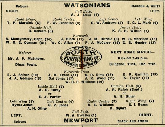 "Always they give us good fare and often a good fight, for generally these hardy Scots are remarkably difficult to beat. Last season there were only five points between the teams at the finish - Newport won by 1 goal, 3 tries, 14 pts. to 3 tries, 9 pt. s. - and it will be remembered that a penalty try was an unusual feature of the Watsonians' score."