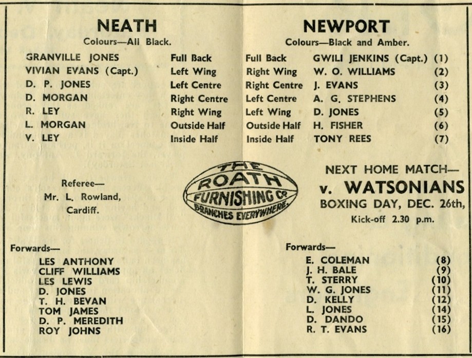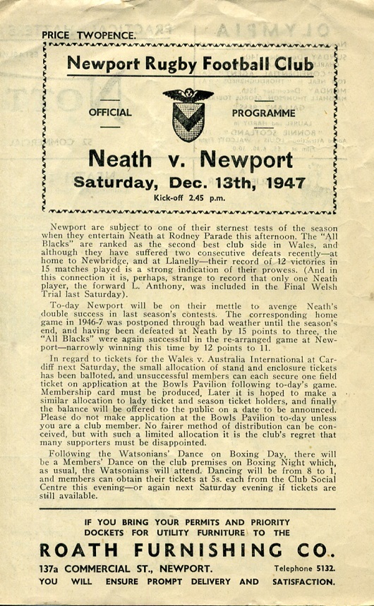 "To-day Newport will be on their mettle to avenge Neath's double success in last season's contests. The corresponding home game in 1946-7 was postponed through bad weather until the season's end, and having been defeated at Neath by 15 points to three, the "All Blacks" were again successful in the re-arranged game at Newport - narrowly winning this time by 12 points to 11."