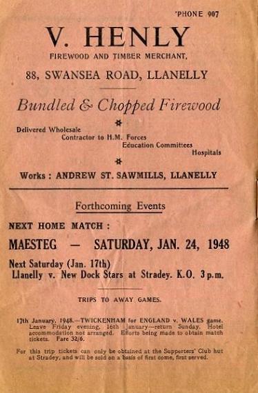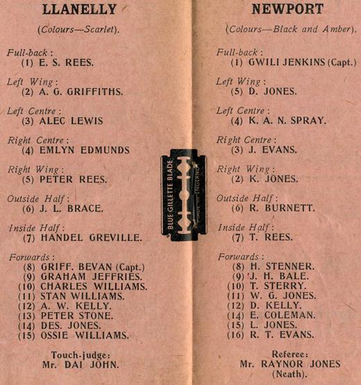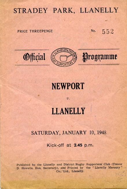 "Newport, always welcome visitors at Stradey, provide the opposition this afternoon. Their playing strength has increased by the discovery of a new centre, and their record shows them to be a side on the up-grade. Both games last season resulted as drawn, but the game played at Uskside this season left Newport clear winners. The Scarlets, however, are showing signs of return to normal form, and it is hoped that both sides will give us a bright and pleasant game to the fullest extent that weather conditions will allow.