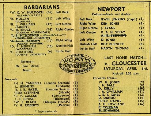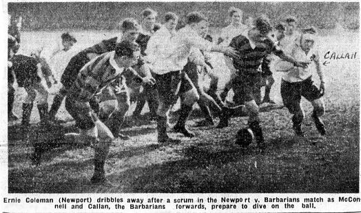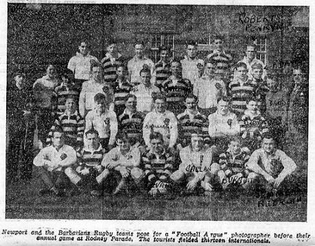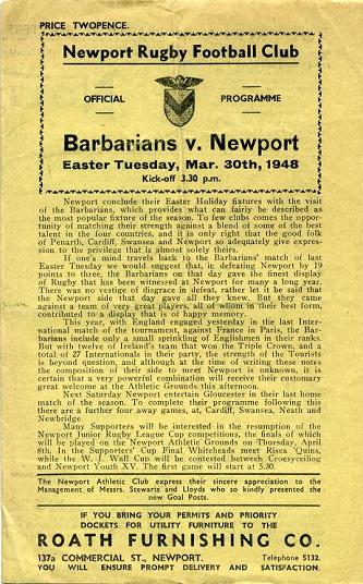 "Newport conclude their Easter Holiday fixtures with the visit of the Barbarians, which provides what can fairly be described as the most popular fixture of the season. To few clubs comes the opportunity of matching their strength against a blend of some of the best talent in the four countries, and it is only right that the good folk of Penarth, Cardiff, Swansea and Newport so adequately give expression to the privilege that is almost solely theirs."
