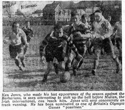 "This year, with England engaged yesterday in the last International match of the tournament, against France in Paris, the Barbarians include only a small sprinkling of Englishmen in their ranks. But with twelve of Ireland's team that won the Triple Crown, and a total of 27 Internationals in their party, the strength of the Tourists is beyond question, and although at the time of writing these notes the composition of their side to meet Newport is unknown, it is certain that a very powerful combination will receive their customary great welcome at the Athletic Grounds this afternoon."
