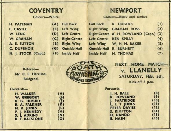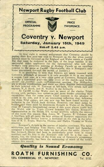 "At first sight it seemed unfortunate that Coventry should be paying their first post-war visit to Newport on the day when central interest must be focussed on the England and Wales match at Cardiff. But that must be reviewed in the light of the large number of unsuccessful ticket applicants for the International who will view to-day's very attractive meeting at Rodney Parade as an excellent counter to the game at Cardiff. (Incidentally, this is Newport's only home appearance through the month of January.)"