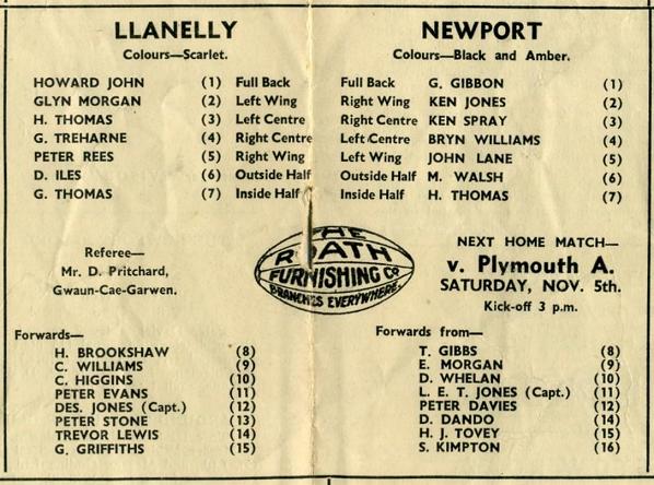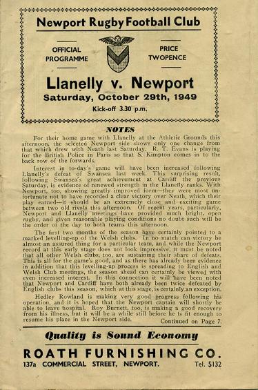 "Interest in to-day's game will have been increased following Llanelly's defeat of Swansea last week. This surprising result, following Swansea's great achievement at Cardiff the previous Saturday, is evidence of renewed strength in the Llanelly ranks. With Newport, too, showing greatly improved form - they were most unfortunate not to have recorded a clear victory over Neath, which their play earned - it should be an extremely close and exciting game between two old rivals this afternoon. Of recent years, particularly, Newport and Llanelly meetings have provided much bright, open rugby, and given reasonable playing conditions no doubt such will be the order of the day to both teams this afternoon."